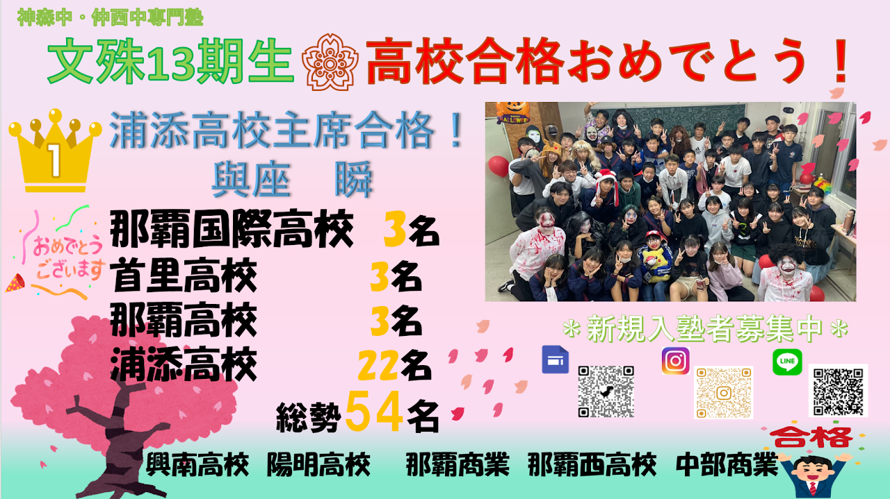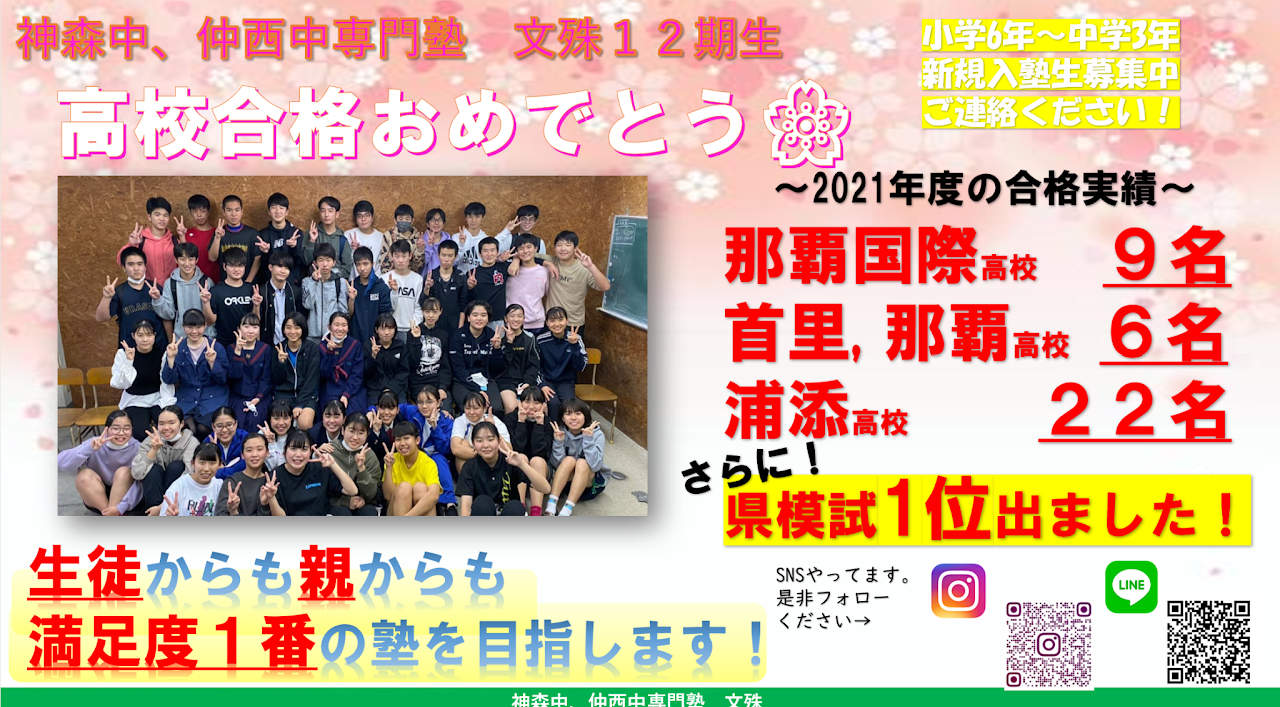 11期生🌸合格実績(2019年度) 浦添高校 主席(1位)合格出ました!